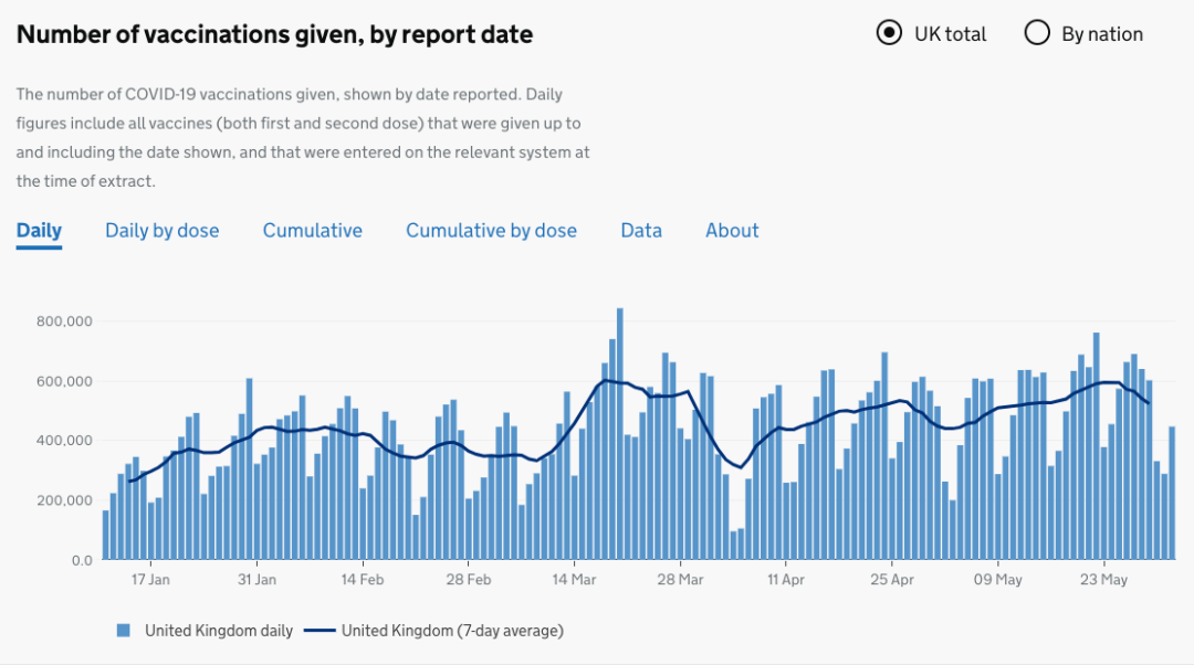 在12月8日至6月1日期间,英国各地已接种了超过6560万支疫苗,其中3950万支第一剂疫苗,占成人的75.2%,超过2600万支第二剂疫苗,占成人的49.5%。