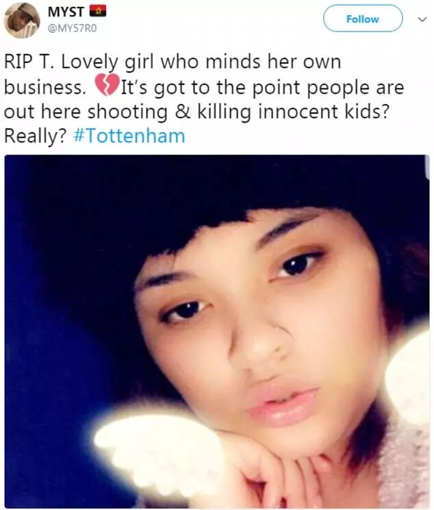 收藏昨天晚上9点35分左右,17岁的女孩Tanesha刚刚从伦敦北部的家中出门,就被一辆车里的恐怖分子开枪打死了。