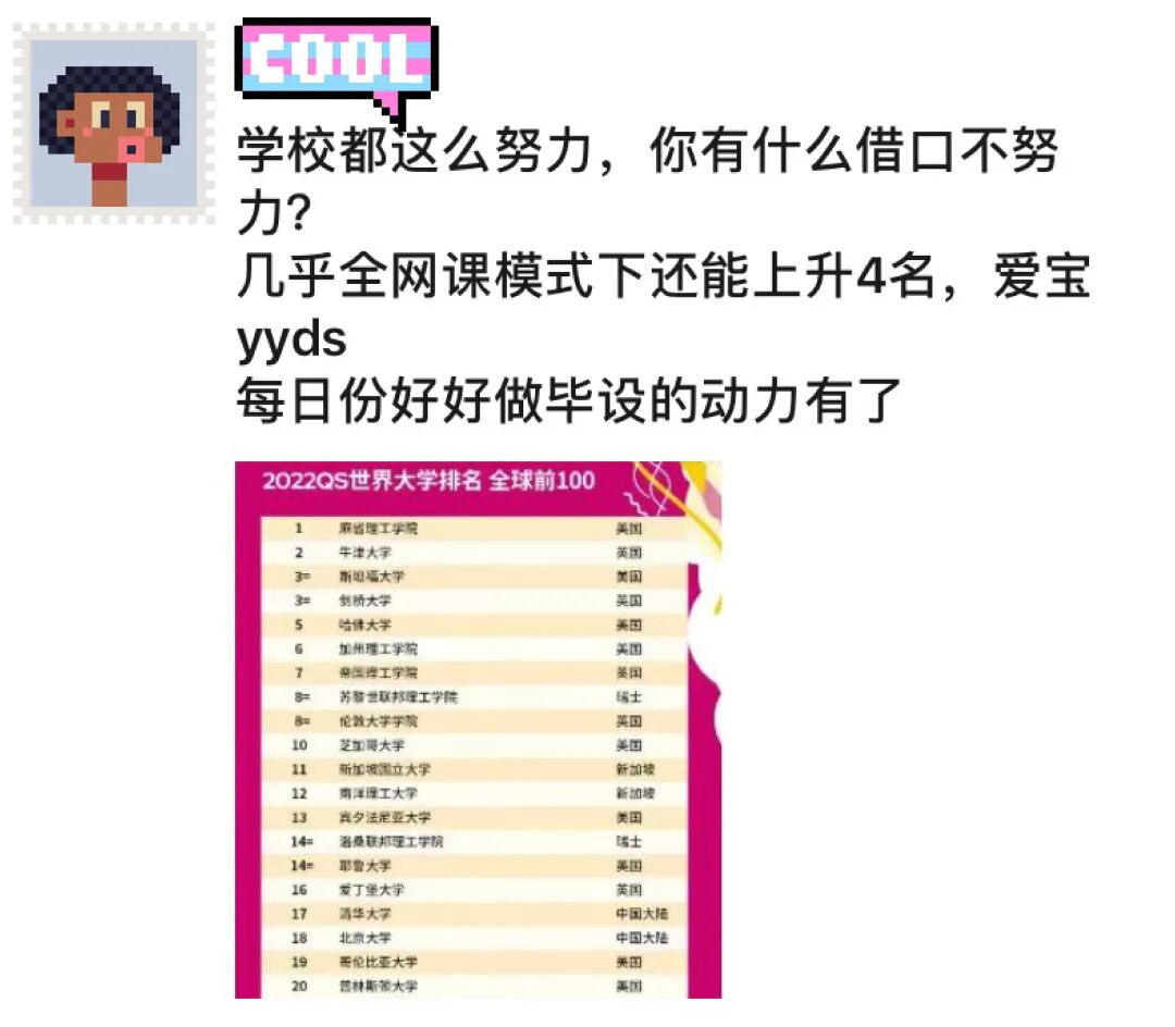 而对于一些留学生来说,自己的母校/梦校稳居QS前100也成为了一种身份的象征!