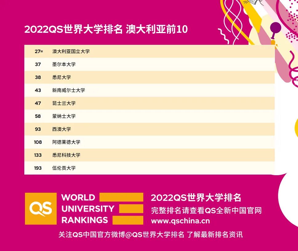 其余的澳洲八大排名分别为:蒙纳士大学58位;西澳大学93位;阿德莱德大学108位。