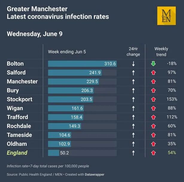 最新感染率数据显示,除博尔顿外,大曼彻斯特地区的冠状病毒病例继续大幅增加。斯托克波特和特拉福德的病例数比上周增加了一倍多,索尔福德的病例数几乎增加了一倍。