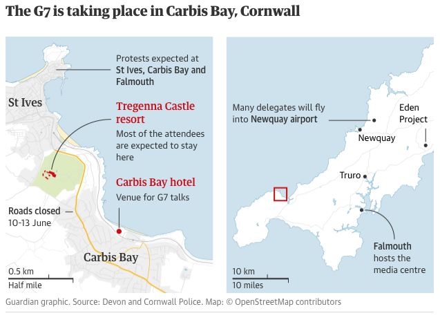 2021年七国集团英国峰会,是新冠肺炎疫情时代的首次世界峰会。会议在卡比斯湾的康沃尔举行,本次的会议安全是至关重要的。军舰停泊在海岸外,英国和美国军用飞机在上空盘旋,警察和特勤局人员也一直在巡逻。