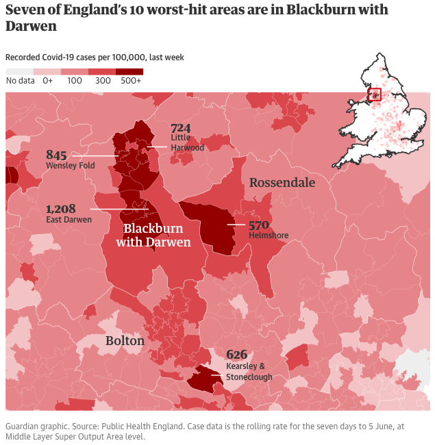根据最新数据,兰开夏郡的布莱克本和达尔文是英国受影响最严重的地方当局,截至6月7日,每10万人中有667例。