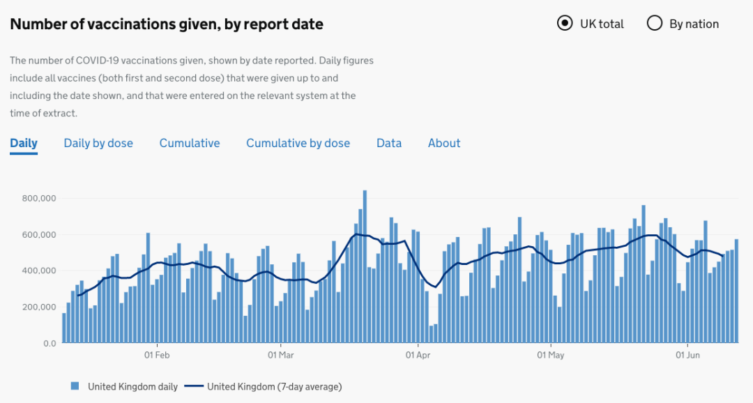 目前英国已有41,551,201人接种第一剂疫苗,29,792,658接种第二剂疫苗,昨日接种574,511人