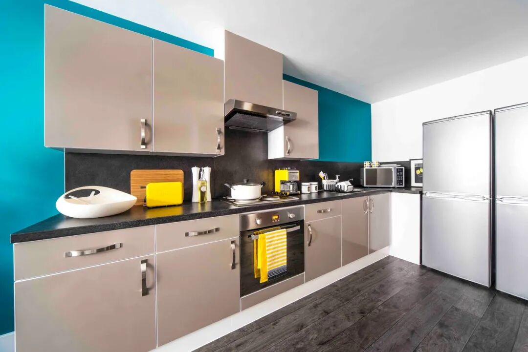 现代化厨房,提供冰箱、炉灶、多功能烤箱等