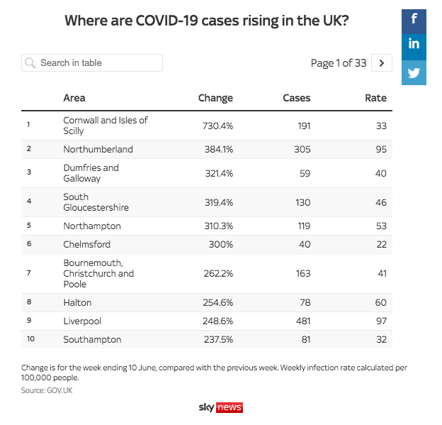 康沃尔,一个受欢迎的夏季度假目的地,记录了最大的增长,每周数字上升730%,达到191例。