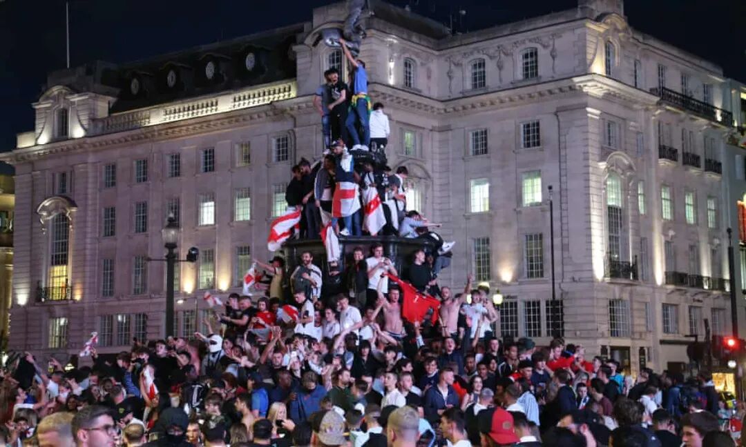 在伦敦的皮卡迪利广场,人们登上沙夫茨伯里纪念喷泉,数千人聚集在附近的特拉法加广场的官方球迷公园。夜幕降临时,莱斯特广场上发生了与警方的冲突。