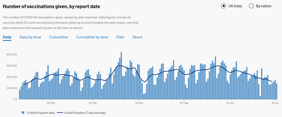 目前英国已有45,135,880人接种第一剂疫苗,33,402,028接种第二剂疫苗,昨日接种283,140人