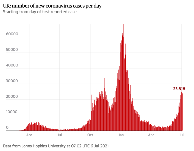 政府预测到7月19日感染率可能达到每天5万人时,贾维德接受“公平地说”这个数字可能会翻倍甚至更多。到目前为止,英国最高的日感染率是在12月下旬,超过81,000人。