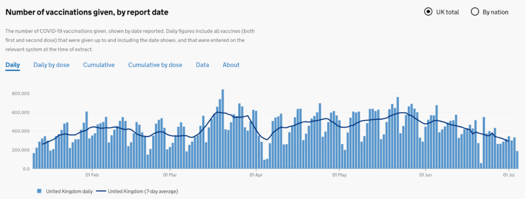 目前英国已有45,351,719人接种第一剂疫苗,33,726,362接种第二剂疫苗,昨日接种188,632人