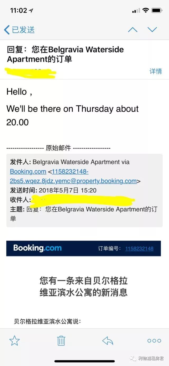 5月7日,公寓的房东向我们发了邮件,询问我们到店时间,我回复他说,20:00左右。
