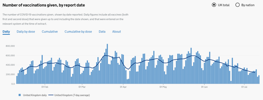 目前英国已有45,978,017人接种第一剂疫苗,34,997,491接种第二剂疫苗,昨日接种179,656人