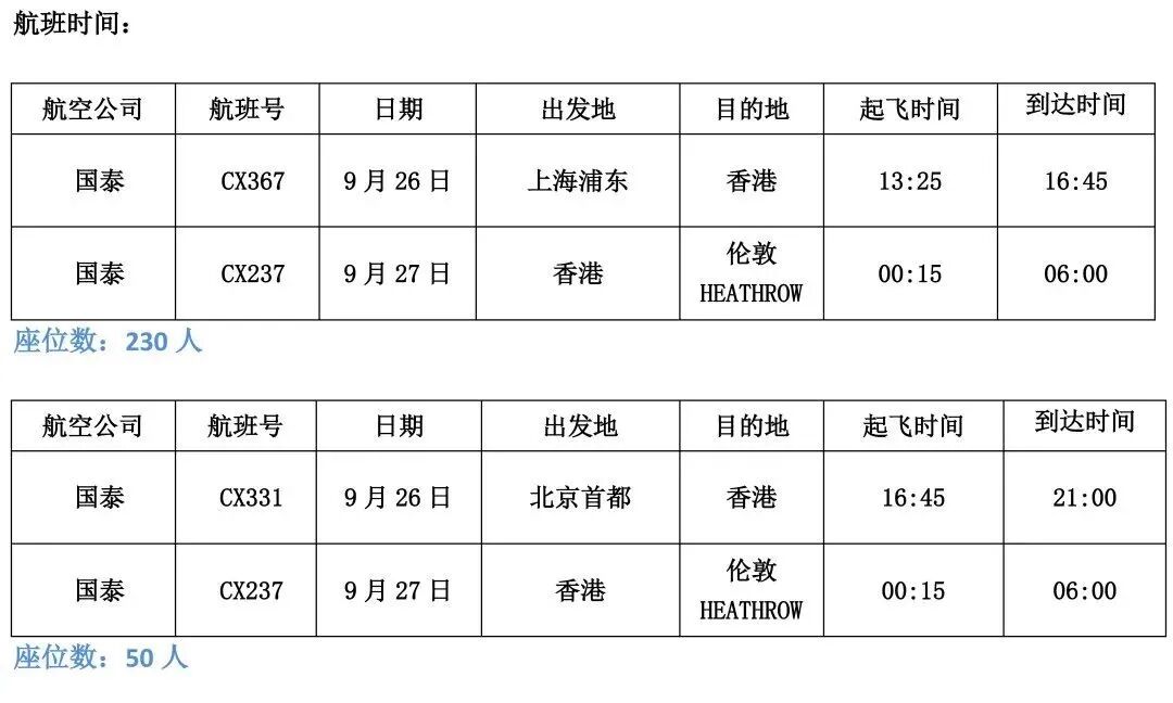 包机航班计划起飞时间:2021年9月9日和2021年9月24日