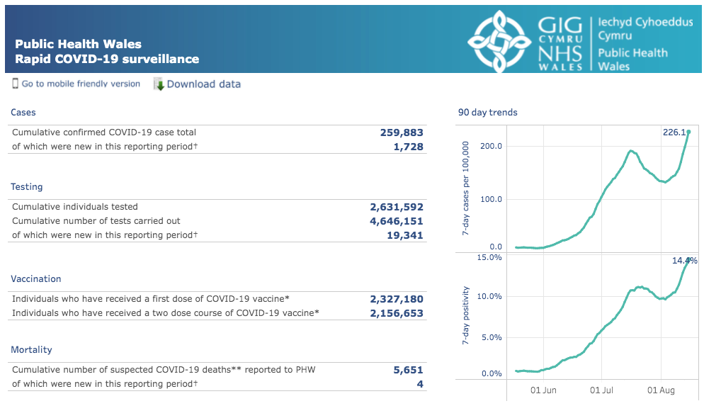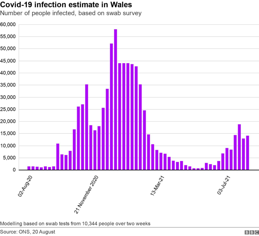 据估计,威尔士有23500人感染了Covid-19。基于检测的病例显示,尽管与第二波相同时期相比,住院人数和死亡人数仍然较低,但感染人数再次上升。