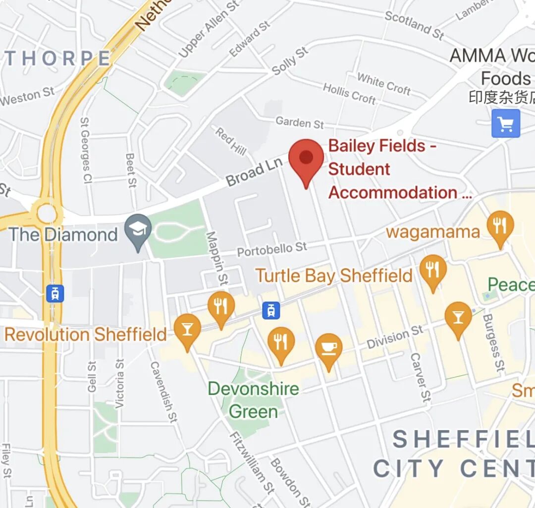 Bailey Fields位于在谢菲尔德市中心的区域,周边生活设施齐全,中超和中餐馆应有尽有。另外步行10几分钟可达商业区,购物生活方便。距谢菲尔德大学、谢菲尔德哈勒姆大学城校区仅几步之遥,位于谢大工学院对面。另外步行9分钟可达The Diamond,完全不用担心迟到问题。