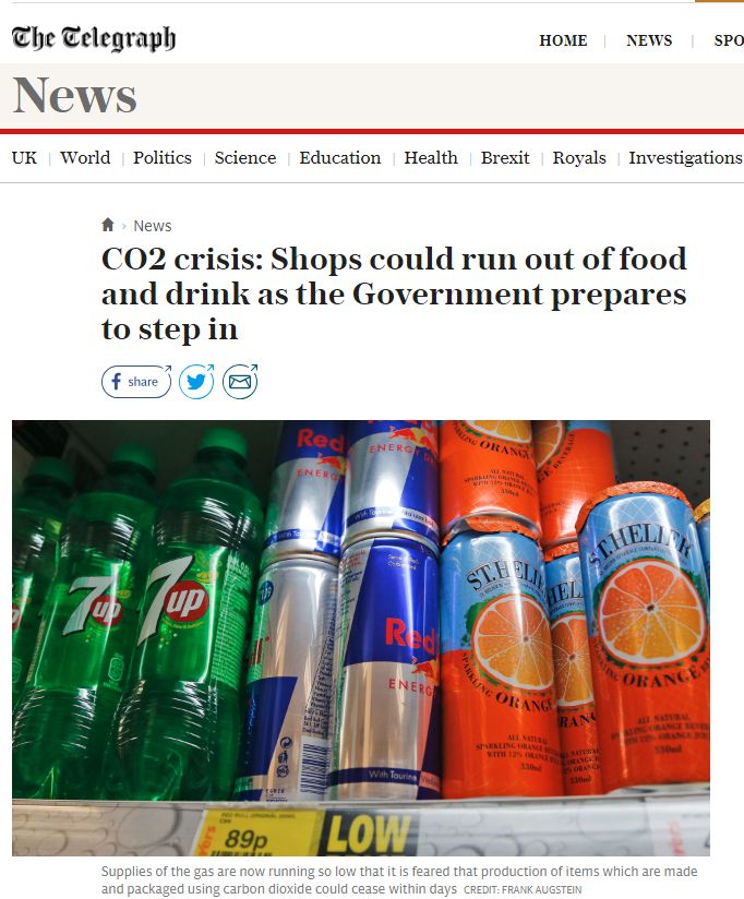 《每日电讯报》:二氧化碳告急,各大超市都面临食品和饮品的短缺,政府时刻准备介入,采取应急措施。