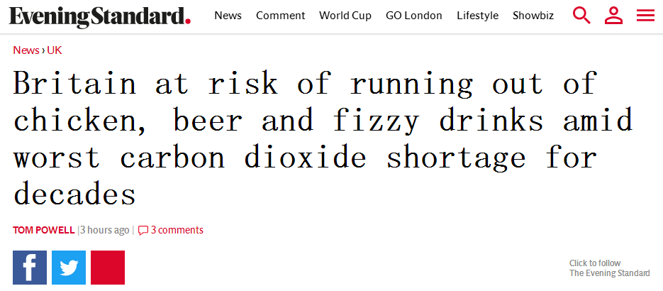 《旗帜晚报》:英国面临着耗尽鸡肉、啤酒和碳酸饮料的风险,是数十年来最为严重的一次二氧化碳短缺。