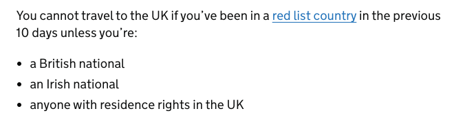 英国政府明确规定:入境以前的10天内,在红色名单国家停留过的(包括转机),非英国和爱尔兰公民拒绝入境。