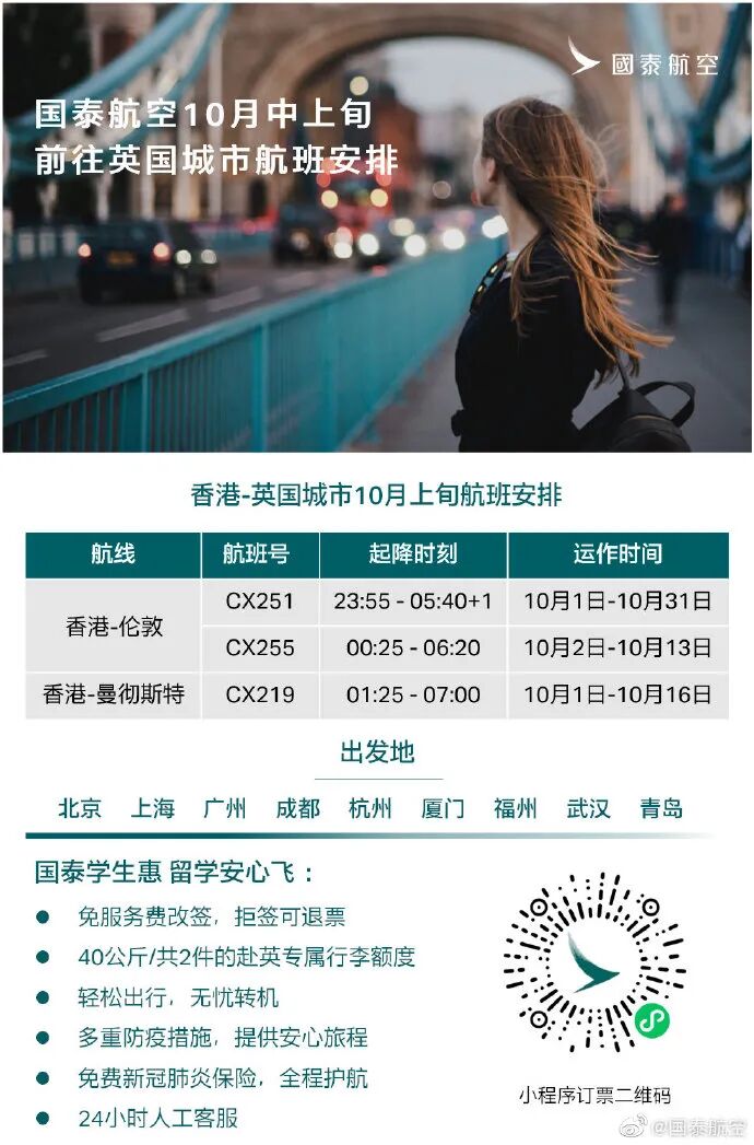10月2日-10月13日,国泰航空新增CX255航班前往#伦敦#;