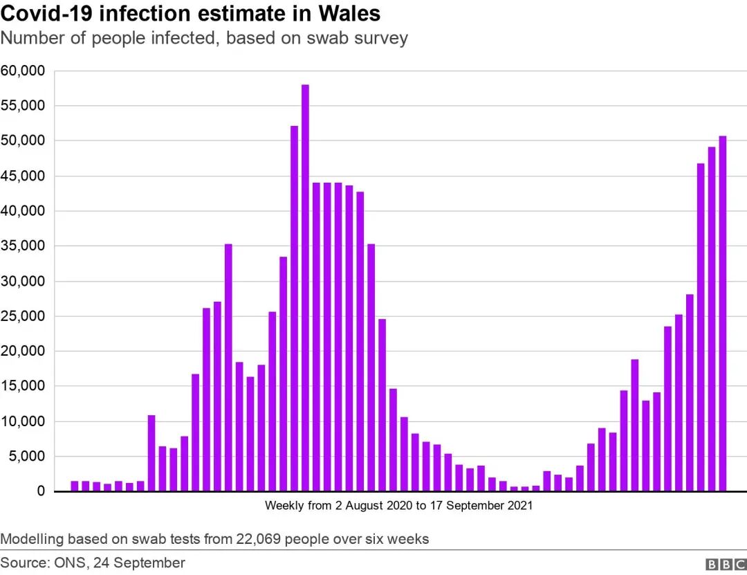 数据还显示,过去一周威尔士99%的新冠病毒检测呈阳性的人都在60岁以下。其中37%未接种疫苗。