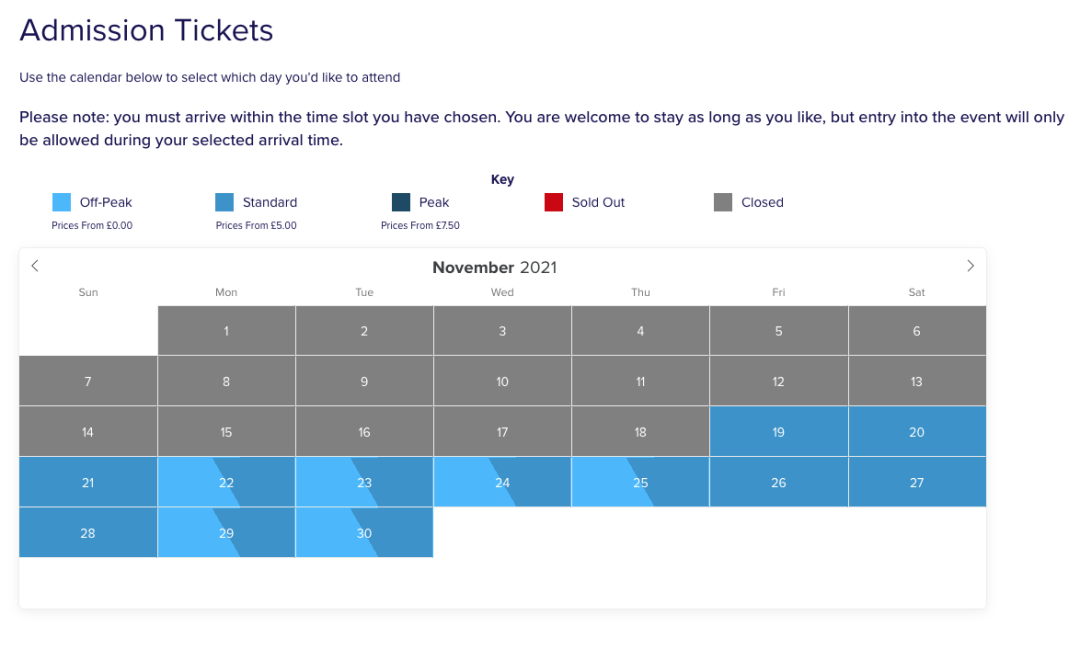 高峰期(12月的每个周末下午1点后)为7.5镑门票
