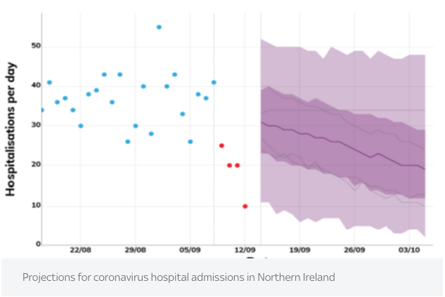 使用预测的中点作为比较,数据显示,从现在到10月3日,英格兰、英格兰所有地区以及威尔士和北爱尔兰的住院人数预计将减少。
