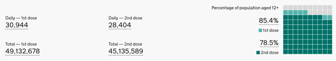 另有28404人同时接种了这两种疫苗,使完全接种的人数达到45135589人(78.5%)。