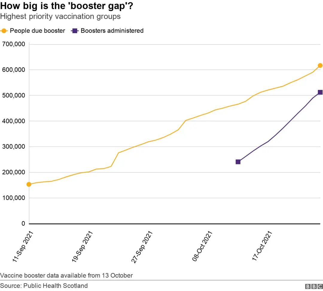 数据显示,苏格兰在最优先接种疫苗的人群中,只有61.6万人获得了加强剂的资格,但只有511807人接种了疫苗。