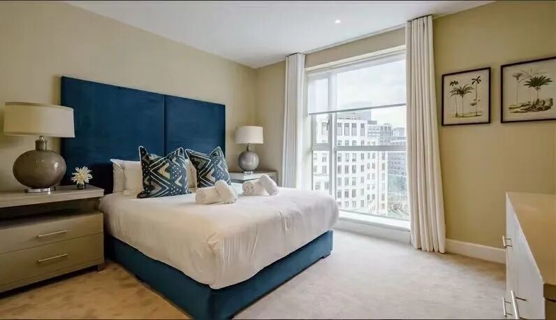房子地理位置好 楼下有中超和超大Sainsbury 公交车站 离vauxhall地铁站步行5分钟 Nine Elms地铁站步行2分钟 有空中花园 配备健身房 房间为1个Ensuite自带超大衣柜 ikea长衣架和厕所 1个侧卧也有独立卫浴 并配有超大景观落地窗