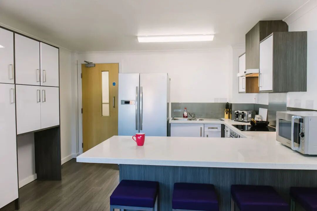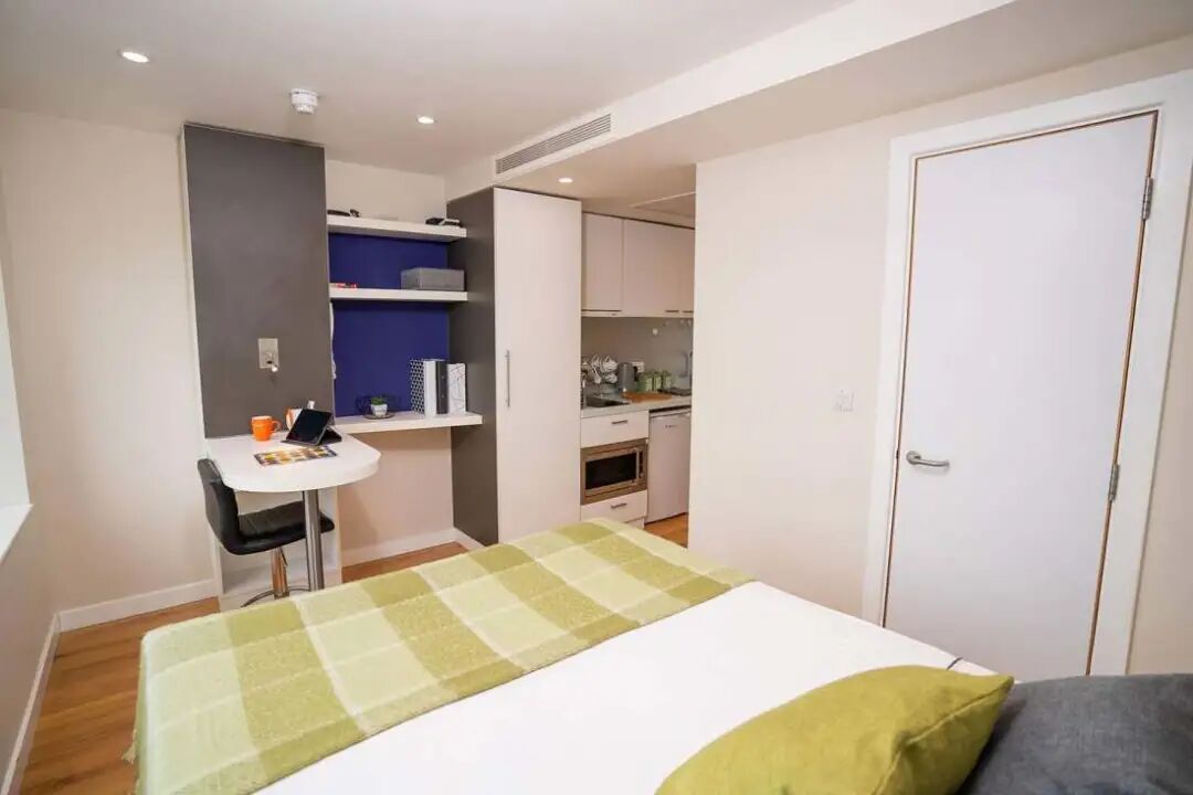 我们的ensuit房型里面配有一张舒适的床、学习桌、大量的储物空间、和一个设施齐全的公用厨房。如果你想要一个属于自己的厨房,你可以选择我们的Studio房型。