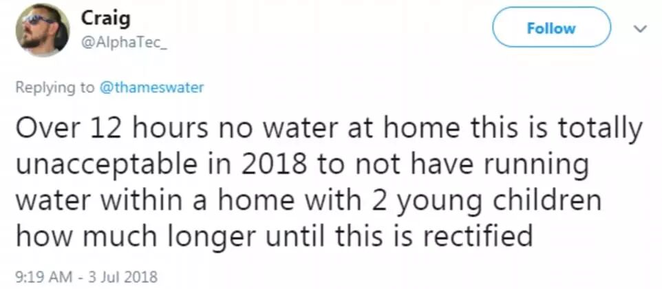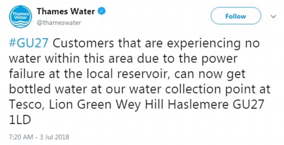 在15英里外的Haslemere也发生了类似的停水事故,由于水库断电,该公司正在 Tesco超市里分发瓶装水。