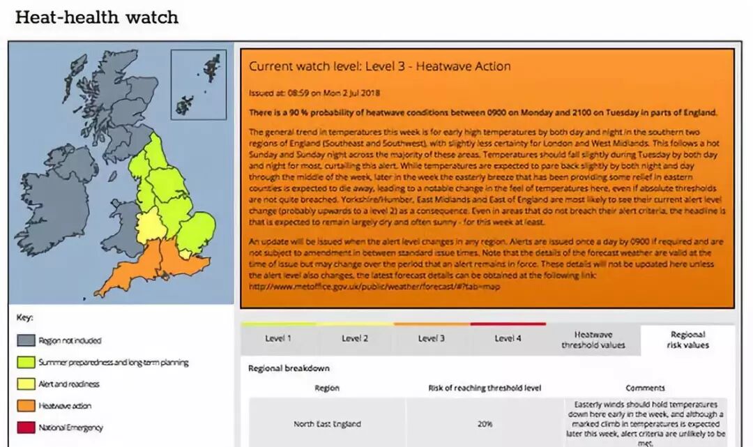对于这样的高温天气,今天早上,政府健康警报上升到“国家紧急状态”下的一级,主要针对英格兰南部的地区。