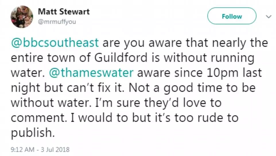 由于泰晤士水务公司水管系统的一个“技术问题”,在吉尔福德(Guildford)的房产没有水或水低压。