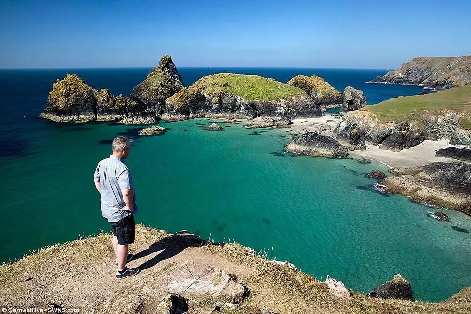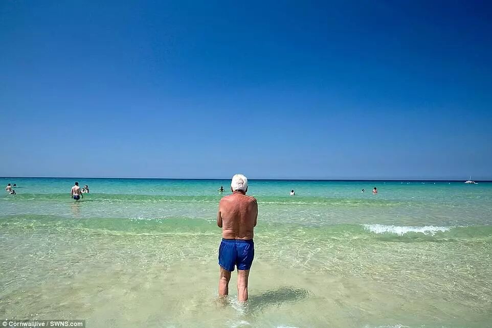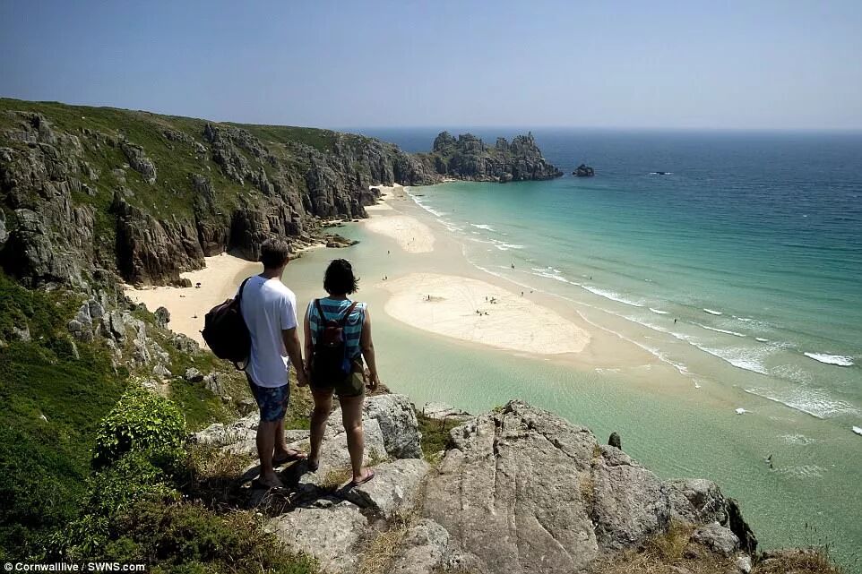 ▲一对从德文郡来度假的夫妇在炎热的天气里眺望了康沃尔郡的Pednevounder海滩