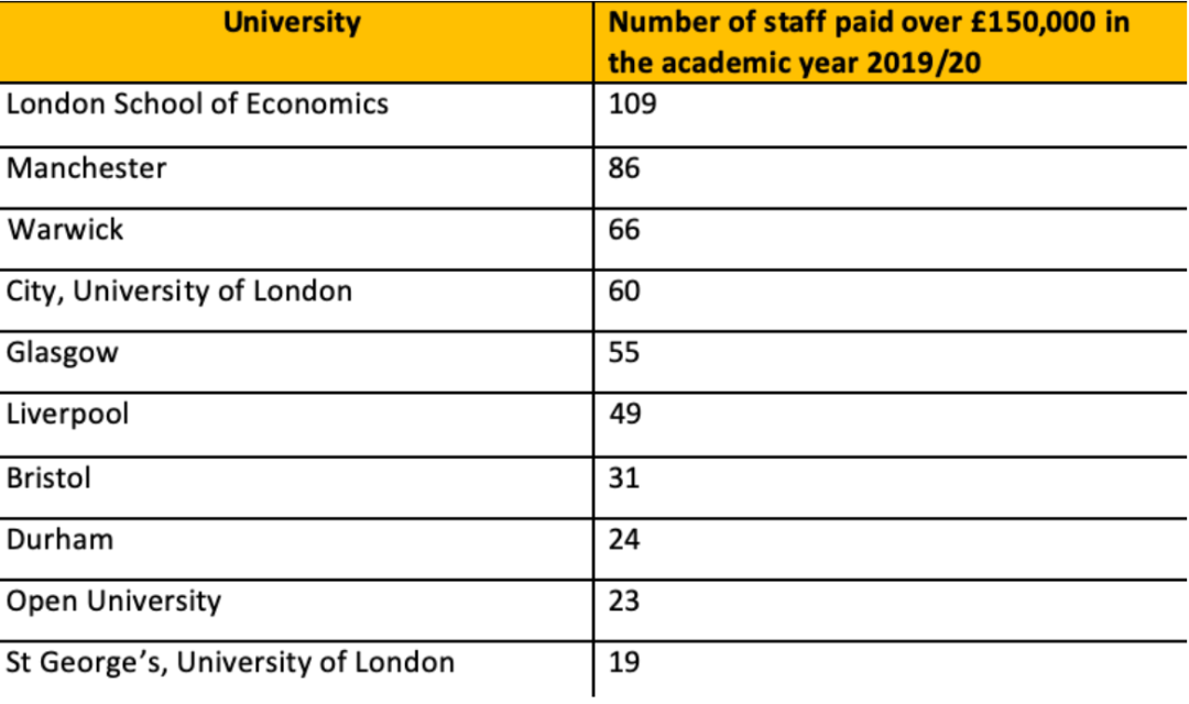 伦敦政经仍位居榜首,有109名教职员工在2019/ 2020学年的薪酬超过15万英镑。