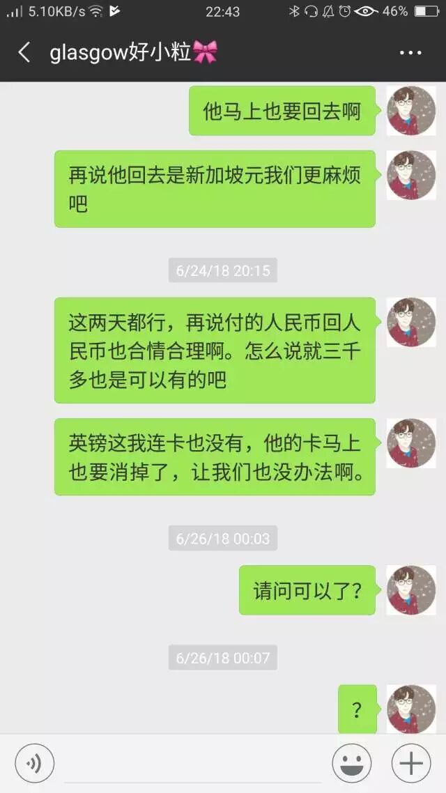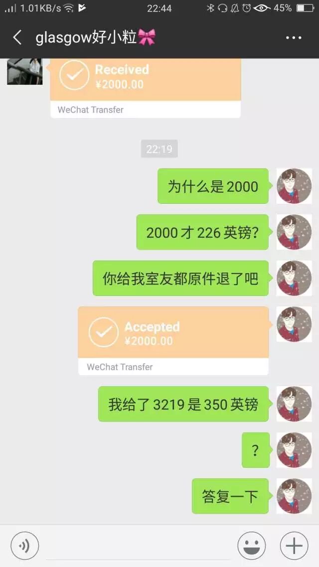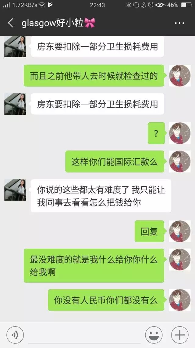 然后大概就昨天人老人家给我甩了2000块钱然后我再喊就没理过!不管怎么说人家都不理了,好!意思说你清洁费要130镑?一个十几平米房间?然后人家新加坡人一份钱不用出就都是我出?真的这人是太厉害了!