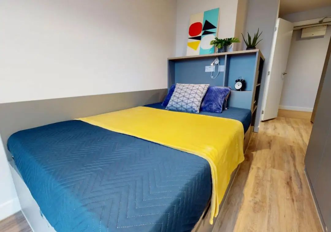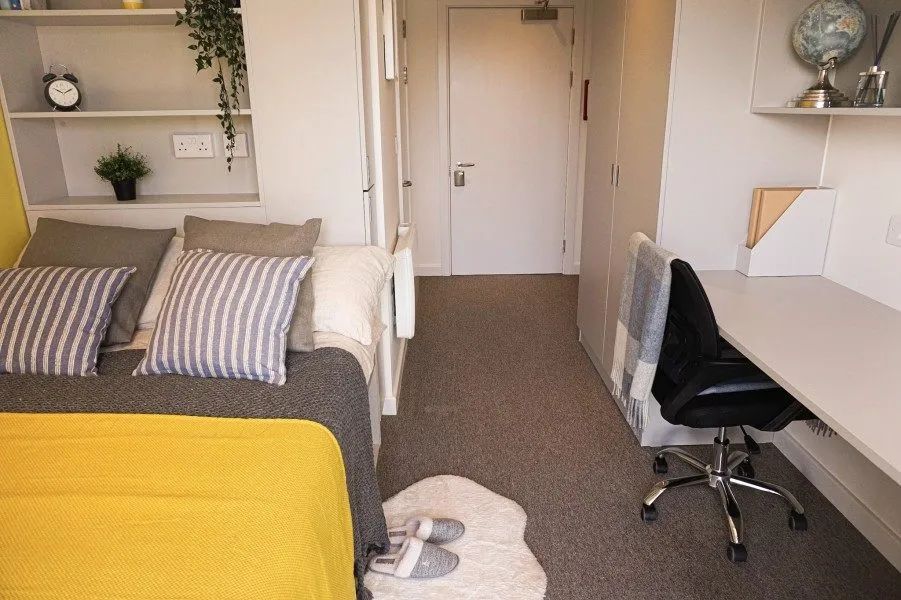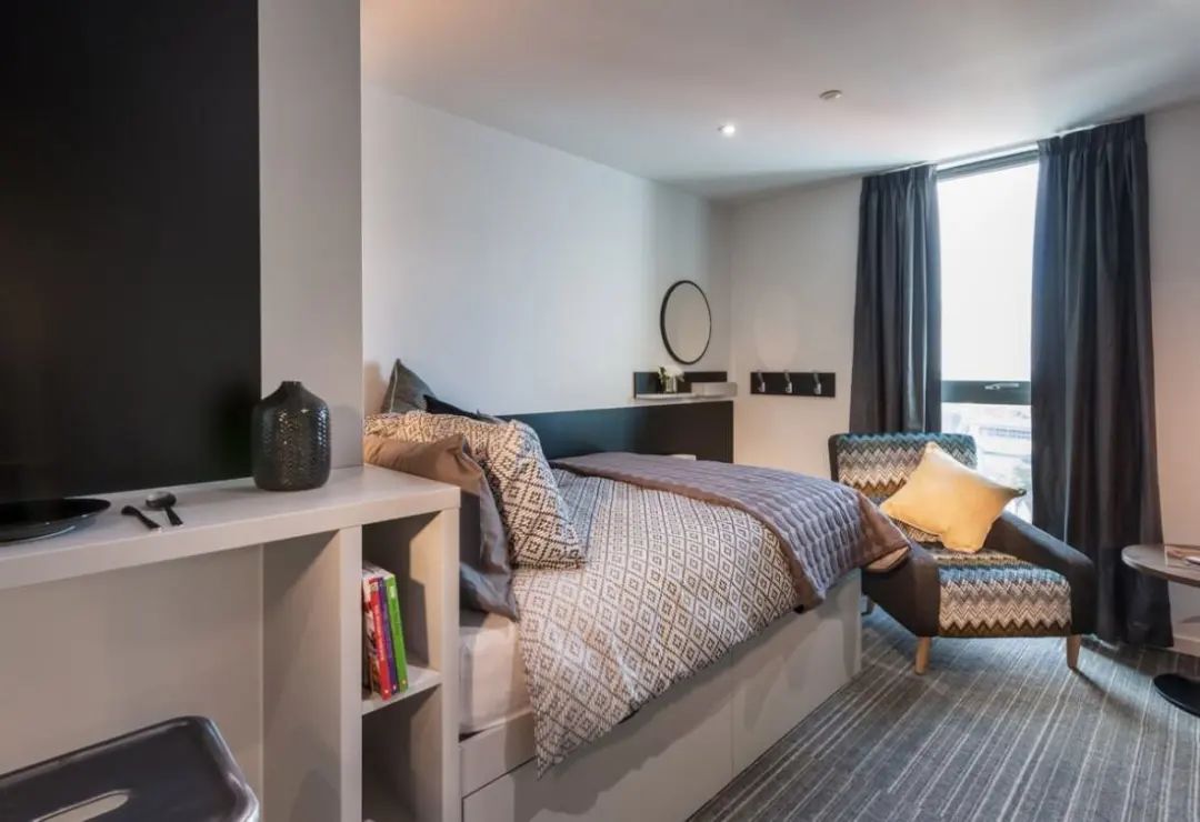 房间内部配有书桌、单人沙发及small double的床(可住下1-2人,且床下储物空间充足)。有电视,可观看电视节目或连接投屏设备,如Switch/笔记本等。同时,公寓给房间配有电热水壶及烤面包机。