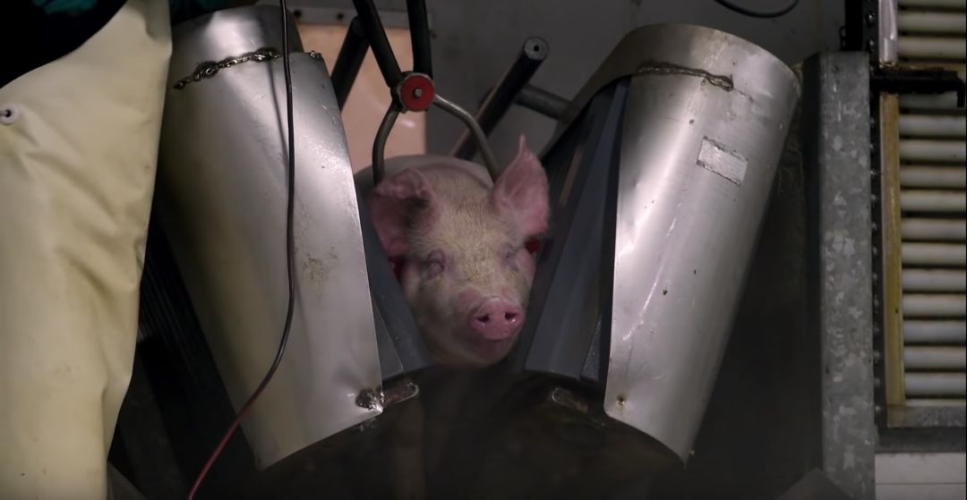 国外的肉类工厂在生产冷冻肉的时候产量大、流程快,工业化屠宰的时候,通常是高压把猪电死,然后割开喉咙倒挂在传送带上一路放血,传送带到头了就进入后面的步骤。