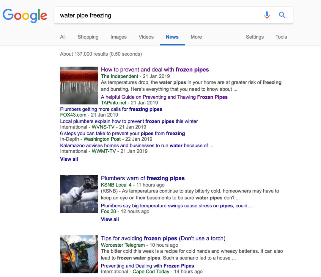 君君默默的查了下Google,发现14个小时之前,大量的关于如何放置水管冻住的新闻就出现了,看来,水管被动不是小事件啊。
