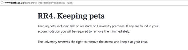巴斯大学规定,没有许可擅自养宠物的,会立即要求把宠物移除校园并且还要自己支付罚金。并且强调了,宠物包含鱼和家禽(鸡鸭)