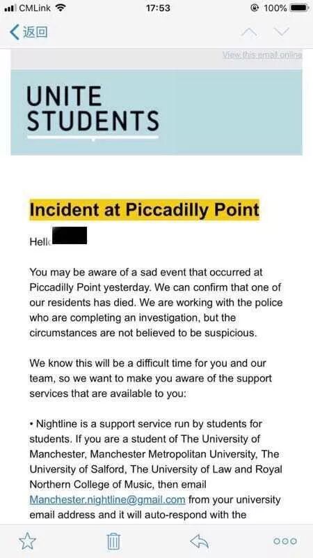 收藏最新消息,Unite Students学生公寓旗下的学生公寓Piccadilly Piont官方发布,一名学生在公寓死亡,具体原因还处于调查中。原因不详!