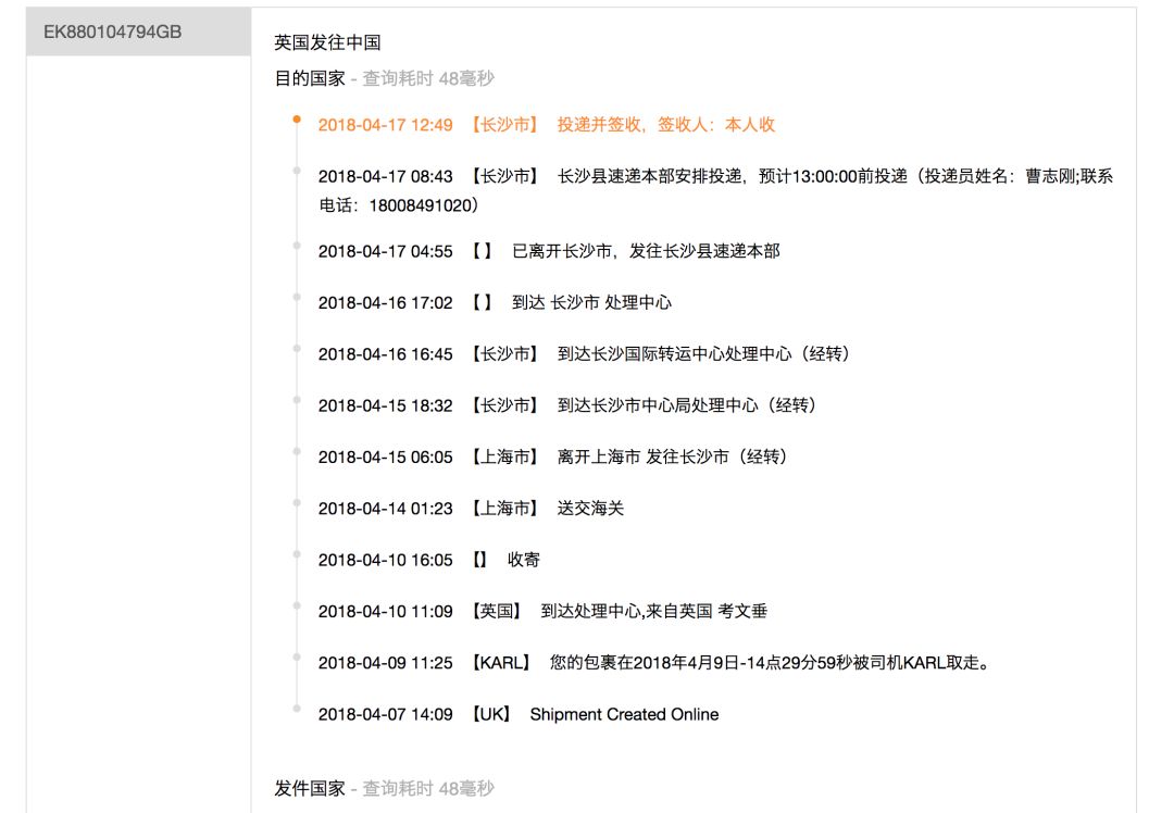 以下截图是君君自己今年亲测的详细物流跟踪截图,整个流程耗时10天。