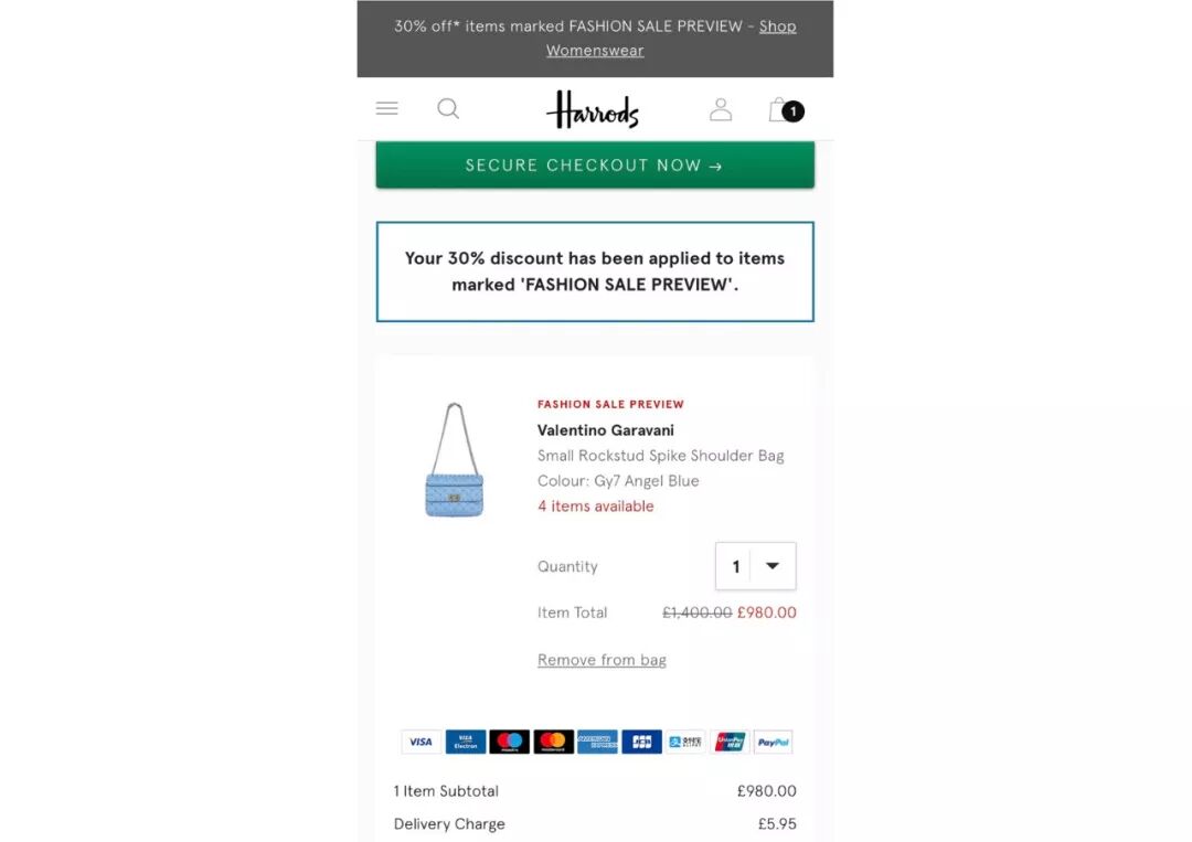 英国最老牌的百货Harrods,Summer Sales Preview 30% OFF,有包包、鞋品、男装、配饰,折扣结算时自动显示。Preview是尺码最全的时候,一定不要以为后面会有更多更全的款式,很多大众码,比如鞋子37,衣服6、8,Preview时就会抢光。