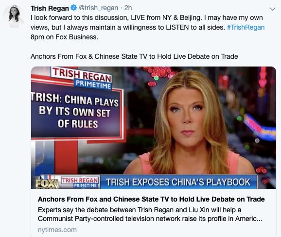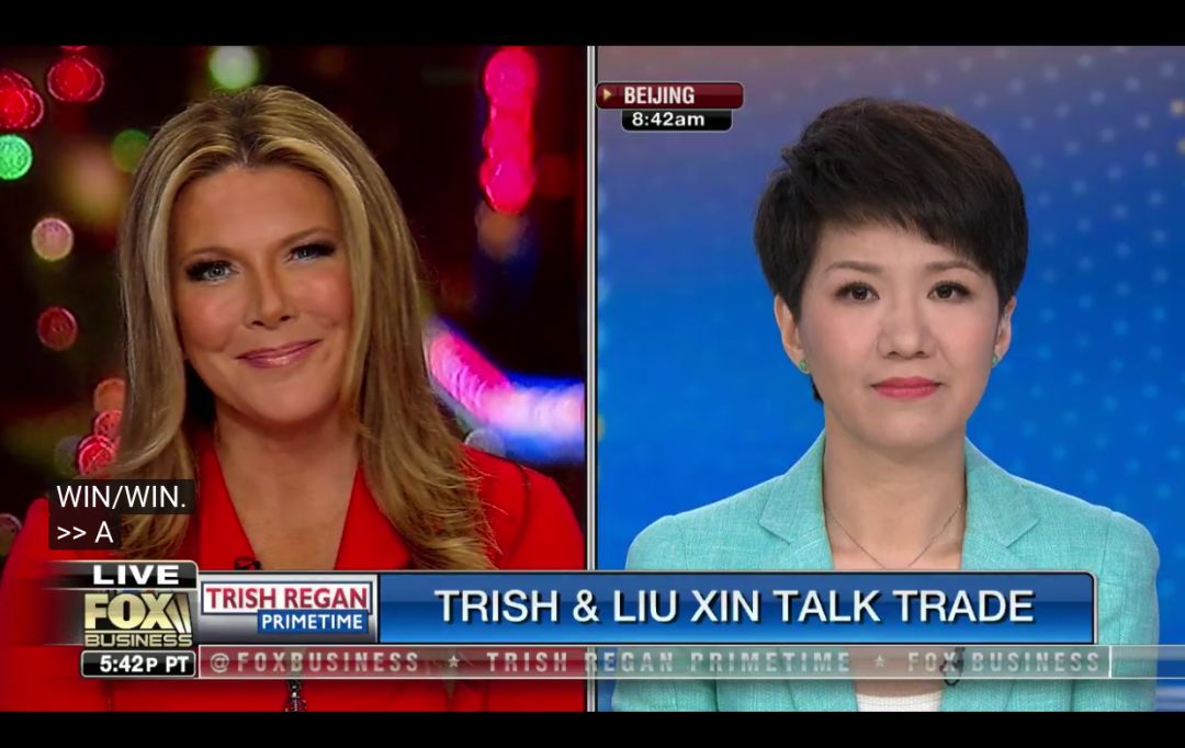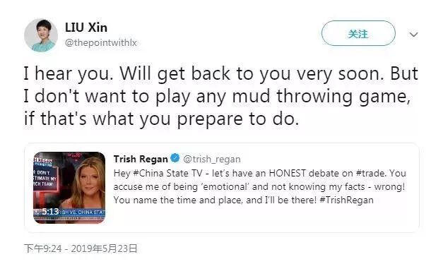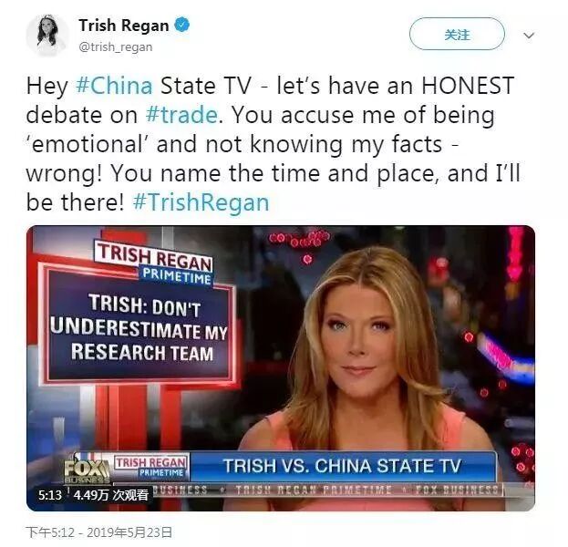 收藏经过一周的“隔空互怼”,我们终于在今天迎来了中国主播刘欣与Fox主播翠西·里根(Trish Regan)的“神仙辩论”。