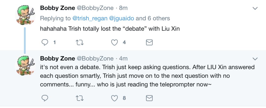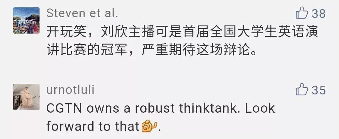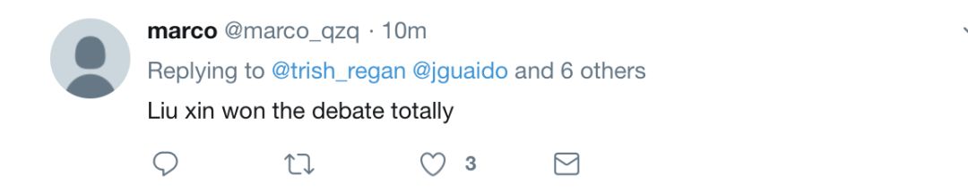 “这根本不是一个辩论。翠西一直在问问题。刘欣巧妙的回答后,翠西就问下一个,也没有评论...可笑...是谁在读提词器啊~”
