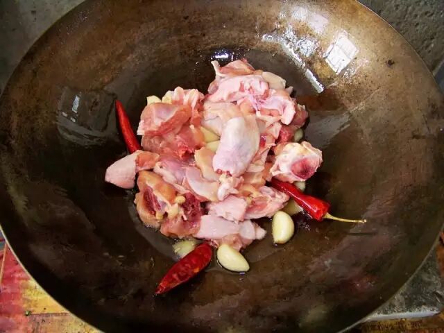 1. 鸡肉斩大块,流水冲尽血水,大蒜去皮,生姜切片待用。