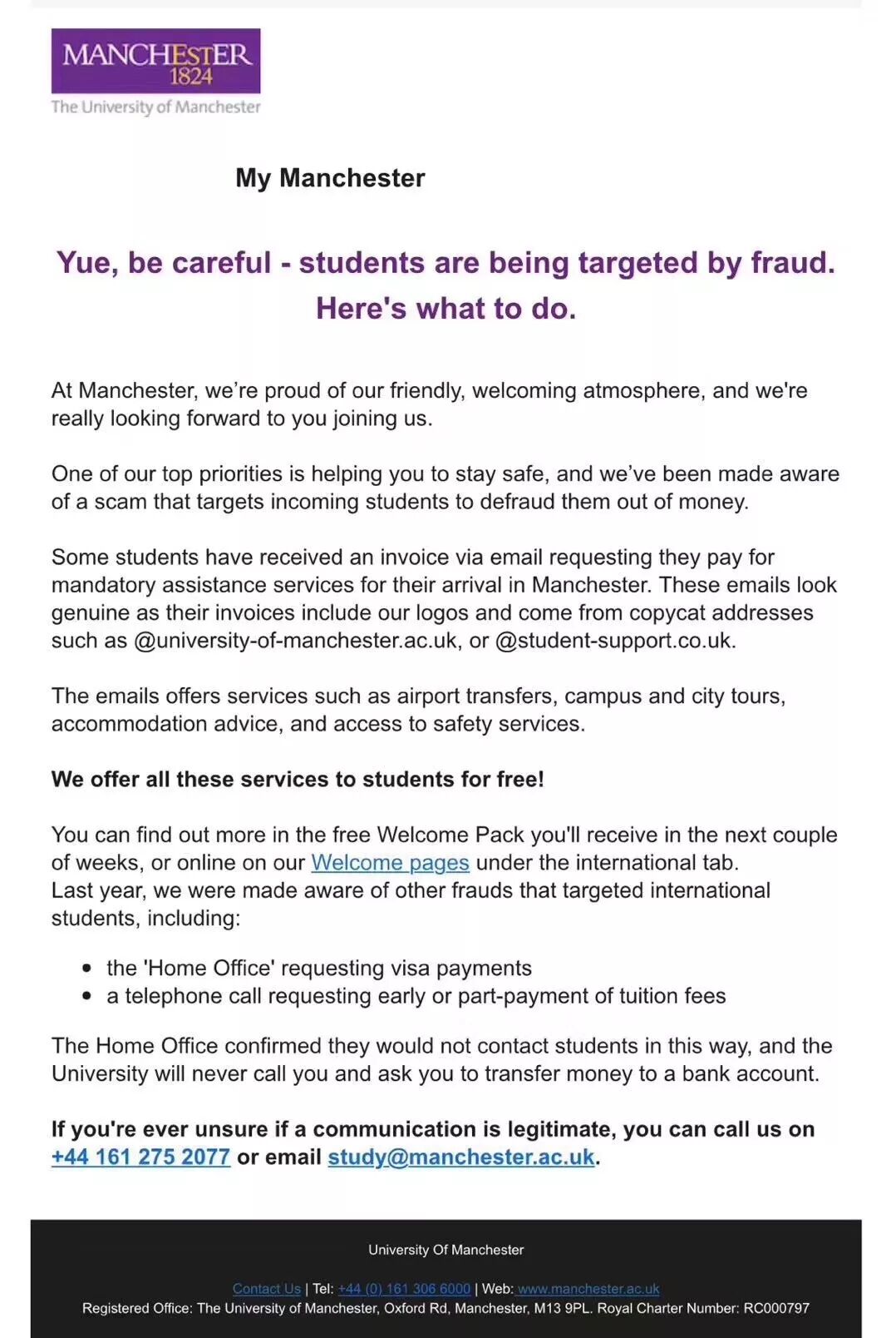 目前有多名同学被骗,曼彻斯特大学已经官方邮件所有的同学要谨防被骗