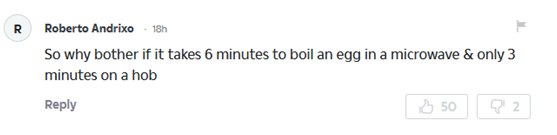 有人表示不理解,“为什么要用微波炉煮鸡蛋?我从来都不会想着去用微波炉煮鸡蛋!”↓