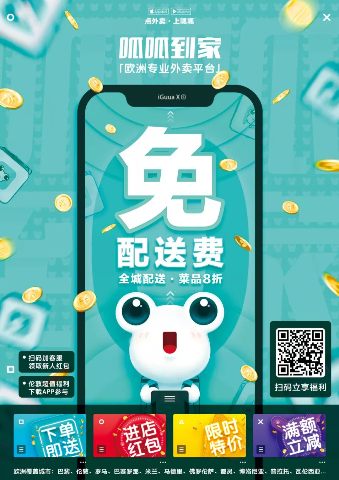 伦敦秋风送“爽”|全城外卖免运费!开学季福利优惠来袭!阅读 1359收藏 广告小声BB:点击"呱呱英国情报局"关注我们哟更多超值优惠/优惠合集/海量福利等来你发现[ 伦敦外卖全城免运费 ]iGuua XTO:"各位吃呱群众们"[英国伦敦上线]感谢英国小伙伴对呱呱的支持与喜爱!一转眼又到开学季啦!外卖海量的优惠活动也正向我们袭来。现在就下载呱呱到家App享受开学季优惠吧!![活动时间]9月17-10月17日"HERE WE GO" 伦敦全城免运费还不够! 还有外卖8折·免费菜品等你!巴蜀人家 [免运费-呱呱到家]满 | 30-5 50-8· 商家热销推荐 [农家小炒肉]延边风味[免运费-呱呱到家]折| 全场满20镑八折· 商家热销推荐 [水煮鱼]凰茶 GoldenTea[免运费-呱呱到家]满 | 20-2 | 30-3· 商家热销 [蛋糕布蕾奥利奥奶茶]河内 Le Hanoi[免运费-呱呱到家]满 | 20-3 | 30-5· 商家热销推荐 [生牛肉河粉]山水间·东北菜[全场折扣-呱呱到家]折 | 外卖全场八折· 商家热销推荐 [羊蝎子火锅]康大厨[免运费-呱呱到家]折 | 全场八折· 商家热销推荐 [水煮牛肉]萨瓦迪卡·泰餐[免运费-呱呱到家]满 | 全场八折· 商家热销推荐 [大虾冬荫汤]齐聚一堂[免运费-呱呱到家]满 | 全场八八折· 商家热销推荐 [东坡肉]康大厨[限时特价-呱呱到家]限 | 赠送饮料· 商家热销推荐 [干锅虾]东园小馆[限时特价-呱呱到家]限 | 满15镑赠送饮料· 商家热销推荐 [冬瓜烧肉]龙门客栈[免运费-呱呱到家]限 | 满25镑赠送任意饮品· 商家热销推荐 [酸菜鱼]香辣居[免运费-呱呱到家]限 | 招牌小龙虾8折 | 麻辣香锅8折 | 烤鱼8折· 商家热销推荐 [小龙虾]凰茶 Golden Tea[免运费-呱呱到家]限 | 满20镑赠送芒果青绿水果茶· 商家热销推荐 [芒果青绿水果茶]山水间[限时特价-呱呱到家]限 | 1镑·肉末茄子 | 1镑·木须肉 | 1镑·干锅花菜 | 1镑·蒜蓉菜心 ... (以上菜品任选其一)· 商家热销推荐 [肉末茄子]树·亚洲餐厅[免运费-呱呱到家]限 | 满30镑赠送饮品· 商家热销推荐 [香辣毛豆]广东元素[免运费-呱呱到家]限 | 外卖下单即送杨枝甘露、堂食满30即送杨枝甘露· 商家热销推荐 [杨枝甘露]巴蜀人家[免运费-呱呱到家]限 | 1镑·泡椒牛柳 | 1镑·农家小炒肉· 商家热销推荐 [泡椒牛柳]扫码注册·领15镑外卖红包[了解详情资讯]打开"呱呱到家App"首页点击活动"BANNER"查看巴蜀人家十周年庆暨中秋节活动![点外卖·上呱呱]欧洲专业外卖平台不想做你的世界,只想做你的厨房这是一个不让你饥饿的私房情报局点击右下角“在看”分享精彩福利