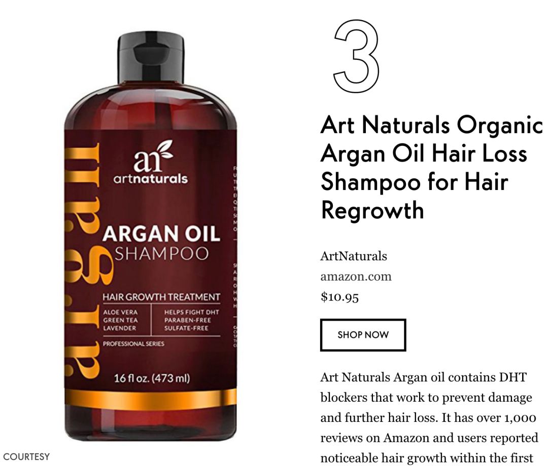Art Naturals摩洛哥坚果油含有DHT阻滞剂,可防止头发损伤和进一步脱发。它在亚马逊上有超过1,000条评论,用户在使用后的前两周内都声称有了明显的毛发生长。